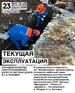 💡 В середине марта специалисты АО «Мособлэнерго» провели работы по ремонту кабельной линии электропередачи для обеспечения надежности электроснабжения более 80 частных домовладений, расположенных в СНТ «Восход», «Мичурина-2», «Пчелка-2», «Дружба-2», «Коломзавод-3» и «Ягодка» в г.о. Коломна.